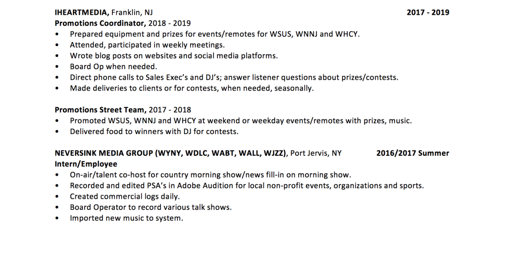 Here you can download or view screenshots of my resume, full of the experience throughout my college career, internship and experiences with iHeartMedia.